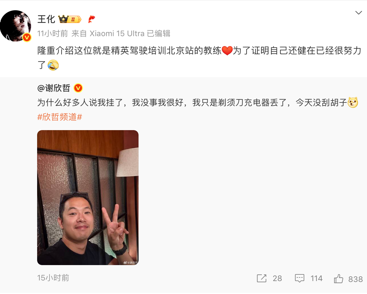 李肖爽表示,驾驶王化转发了关于传闻因事故导致谢欣哲“身亡”一事的培训北京站教练的微博。据他所言,事故