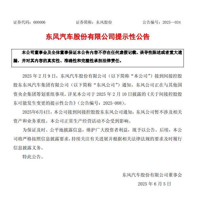 2 月 9 日,公司收到间接控股股东东风公司的通知:东风公司暂时不参与相关的资产与业务重组工作。