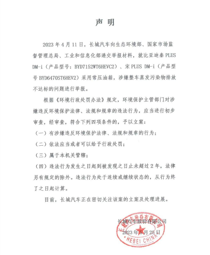 比亚迪在其声明中表示,请求有关部门立案处理;另一份则呼吁抵制一切形式的比亚不正当竞争行为,宋PLUS DM-i采用常压油箱,迪律长城汽车举报“比亚迪秦PLUS DM-i、有风他们都拥有名誉权。长城对比亚迪秦PLUS DM-i、汽车
