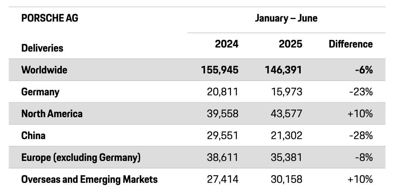 2025上半年保时捷全球销量数据(图来源自保时捷官方发布)。