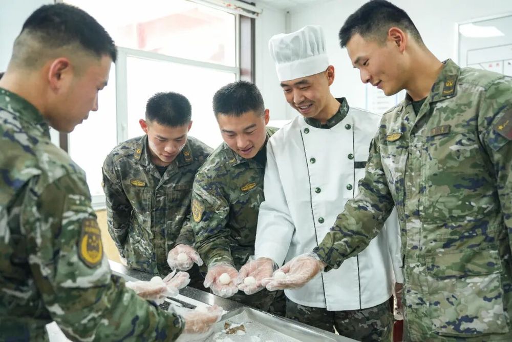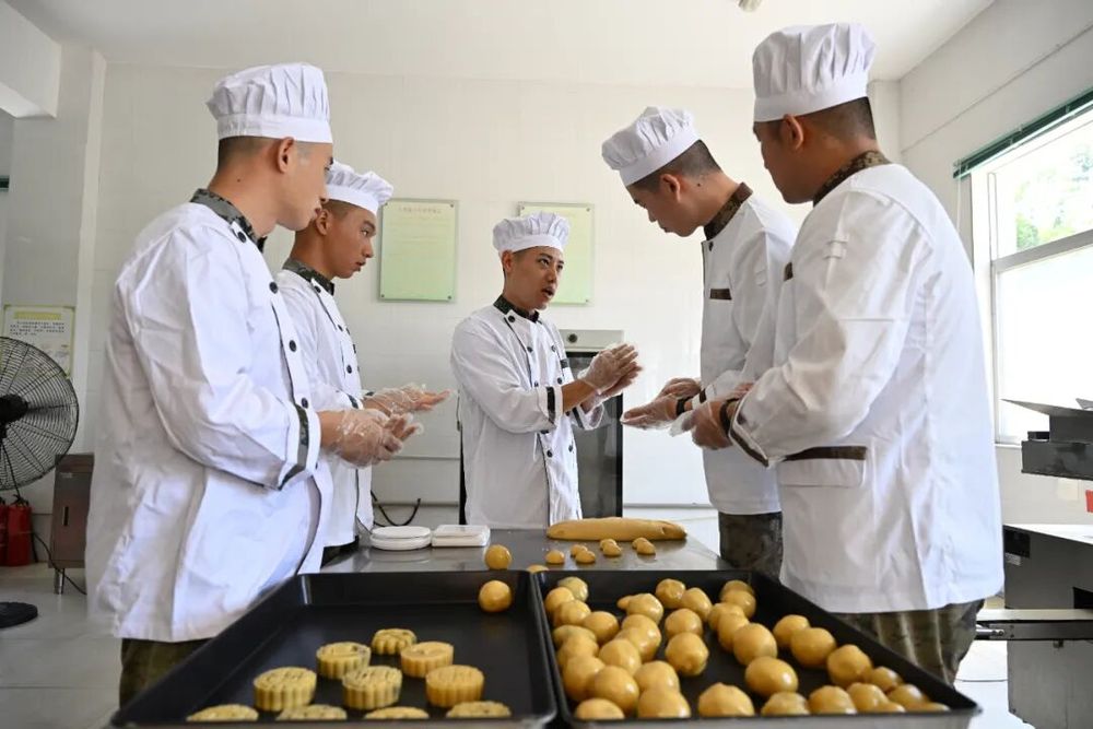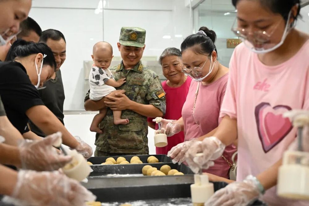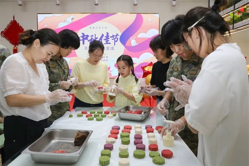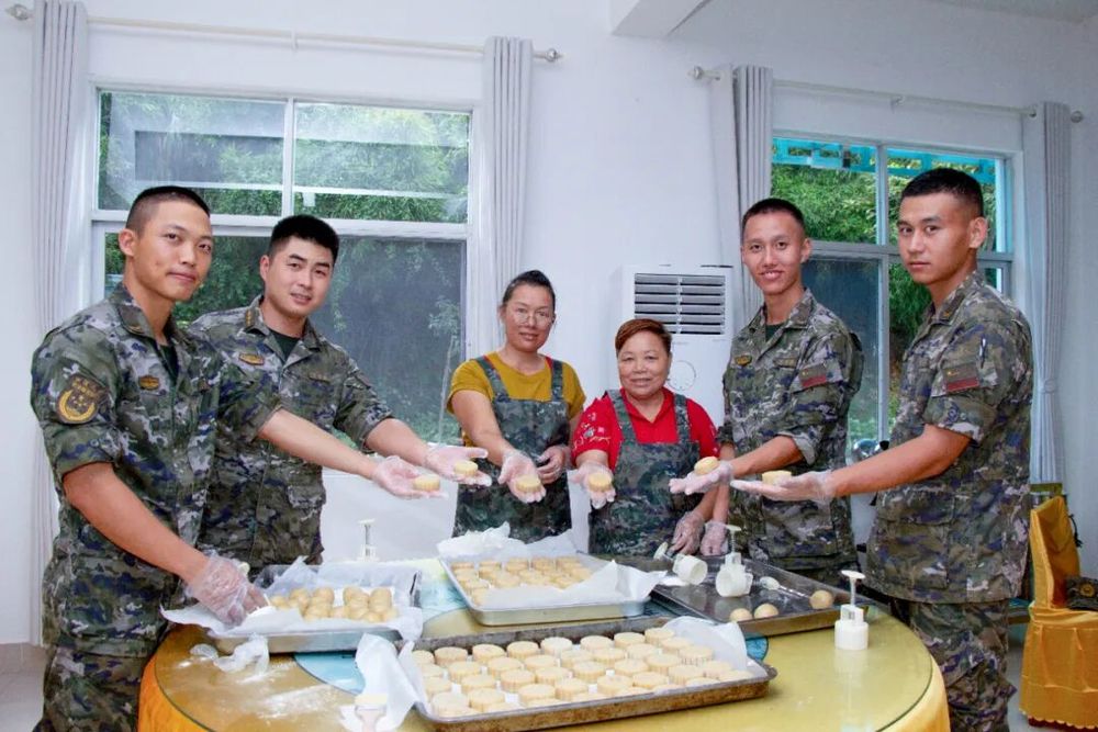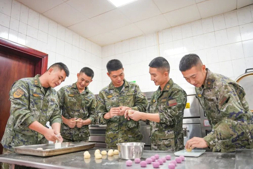 官兵们精心制作各种富有创意和特色的制的真香月饼。包馅、月饼
