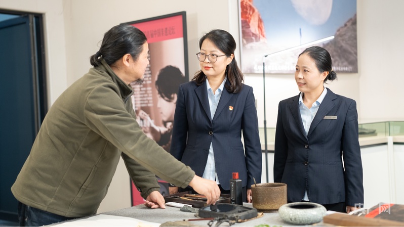 胡雍与中行黄山分行工作人员探讨了工作室的发展情况。非遗焕新、技艺